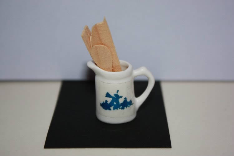 White jug with blue motif and wooden utensils. 2.5w x 1.5d x 4h cm. Just the finishing touch for the kitchen.
