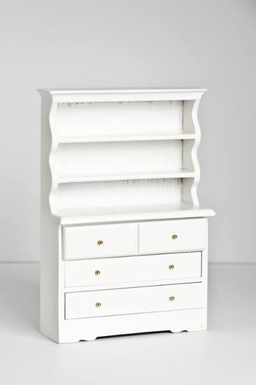 White kitchen hutch with opening drawers. 10.0w x 15.0h x 3.5d cm.
